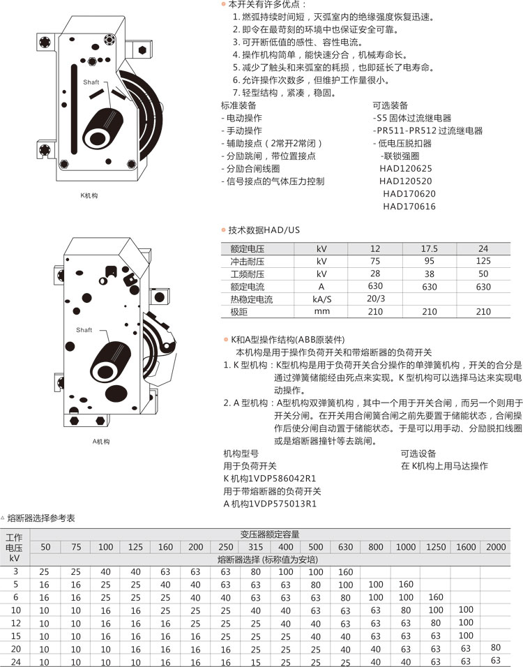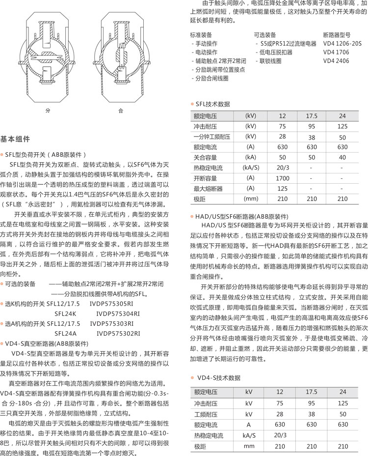 環網柜的主開關、操作機構及元器件采用ABB公司原裝件或采用進口部件國內組裝生產的SFL-12/24型 開關設備,也可根據用戶需要配裝ABB公司原裝HAD/US型SF6。斷路器或VD4-S型真空斷路器,其操作方式分為手動、電動兩種。
